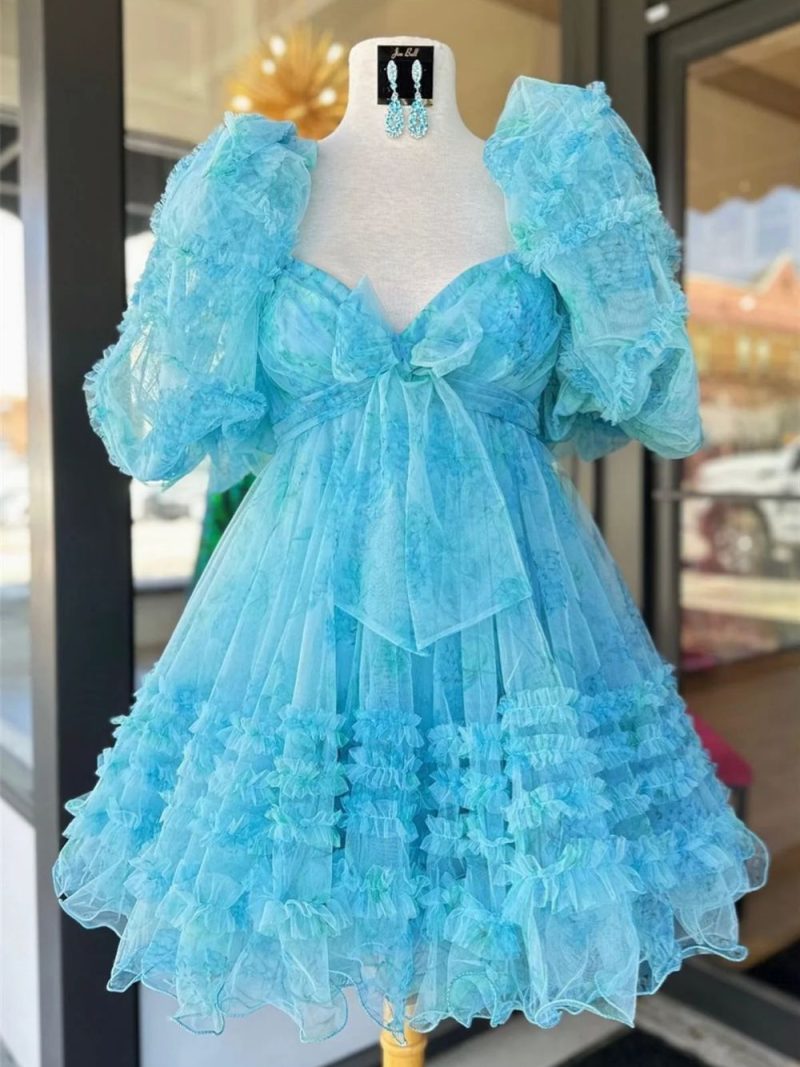 Puff Sleeve Ruffled Bow Short Skirt Homecoming Dress Supports Multi-color Customization