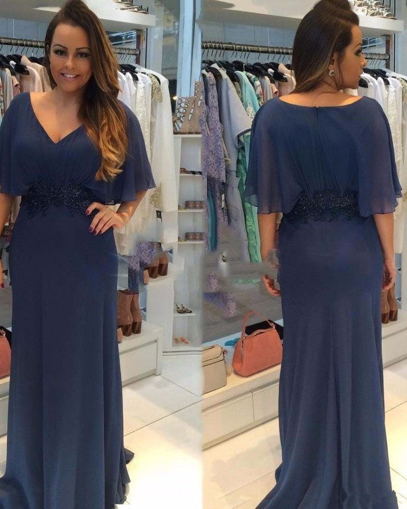 Navy Blue V-neck Mother of the Bride Dresses with Lace Appliques Wide Sleeve Chiffon Formal Evening Gowns for Wedding Party