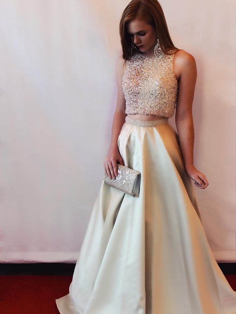 Charming Two Pieces Set Party Dress Beads Tops A-line Long Prom Dress
